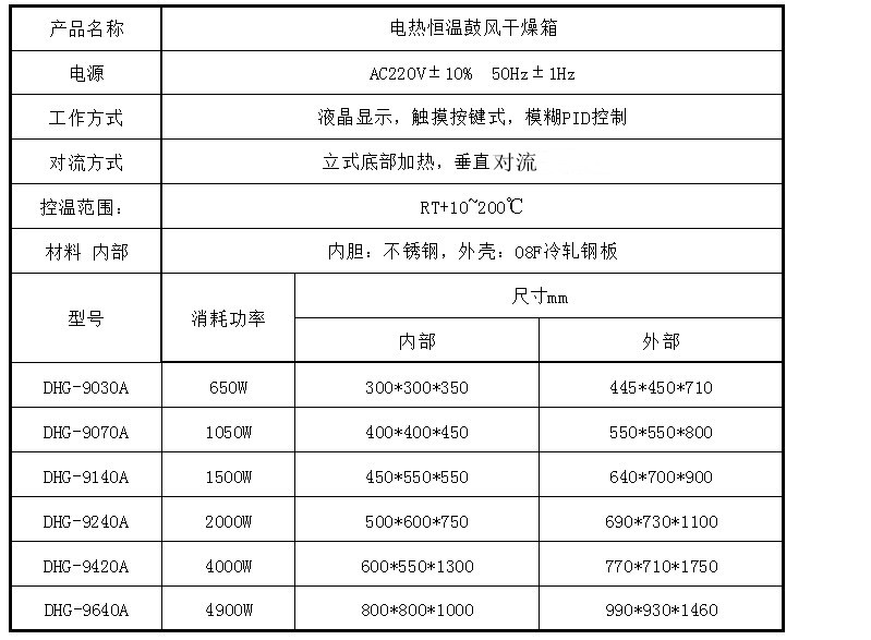 1. 立式,底部加热式,垂直强迫对流,选用品牌风机,保证工作室温度均匀。